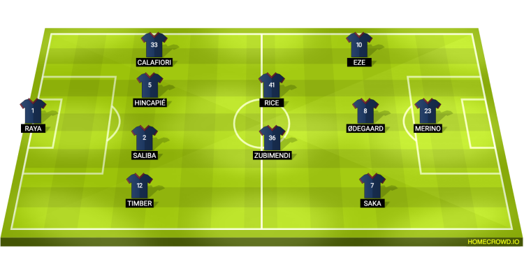 Предполагаемый состав Арсенала: Рая; Тимбер, Салиба, Хинкапи, Калафиори; Зубименди, Райс; Сака, Эдегор, Эзе; Мерино