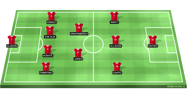 Предполагаемый состав «Ливерпуля»: Алиссон; Фримпонг, Конате, ван Дейк, Керкез; Джонс, Гравенберх; Гакпо, Мак Аллистер, Виртц; Экитике